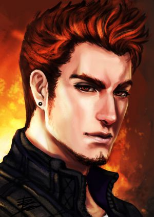 Młody, blady rudzielec, któremu wyraźnie zależy na dobrej prezencji. Jego jasna karnacja kontrastuje z ciemniejszym odcieniem włosów i wskazuje na korzenie Askalońskie. Brązowe oczy i ze względu na nisko osadzone oraz ostro zakończone brwi agresywne spojrzenie są atutami, które lubi wykorzystywać przy poznawaniu przedstawicielek płci przeciwnej. Posiada wyraźnie zaznaczone kości policzkowe oraz kości szczęki. Dba o swój wygląd. Zawsze idealnie przycięta broda, fryzura ułożona przy pomocy lakieru to elementy jego wyglądu, które wydają się nigdy nie zmieniać. Aż dziwne, że przy jego zdolnościach władania ogniem, jego włosy są jeszcze na miejscu. Wygląd twarzy uzupełnia prosty i skromny, okrągły, czarny kolczyk w prawym uchu oraz zwyczajna wykałaczka, którą często trzyma pomiędzy wargami.