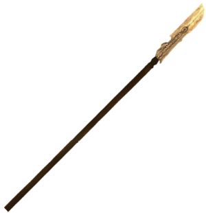 • -Kostur zakończony ostrzem wielkości małego miecza, również nosi go przyczepionego do uchwytu na plecach.