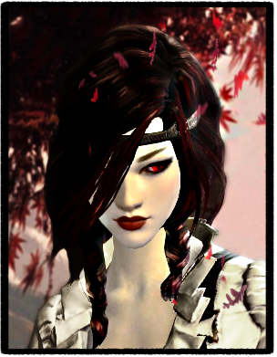 Włosy kobiety są gęste i nieco sztywne, w kolorze ciemnego mahoniu, ścięte krótko nad karkiem, a z przodu zaś sięgające ramion, zaplecione w dwa warkocze. Większość niesfornej czupryny poskromiona jest skórzanym rzemieniem, przewiązanym wokół głowy.