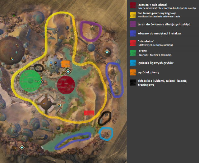 - Tor do treningu jazdy na wierzchowcach - rozciągający się przez cały Azyl, wyznaczony przez pochodnie i flagi umożliwia trening zarówno w dzień i w nocy. Trudny teren, liczne zakręty, a nawet odcinek przeciągnięty przez płytką wodę mogą stanowić wyzwanie nawet dla wprawionych jeźdźców